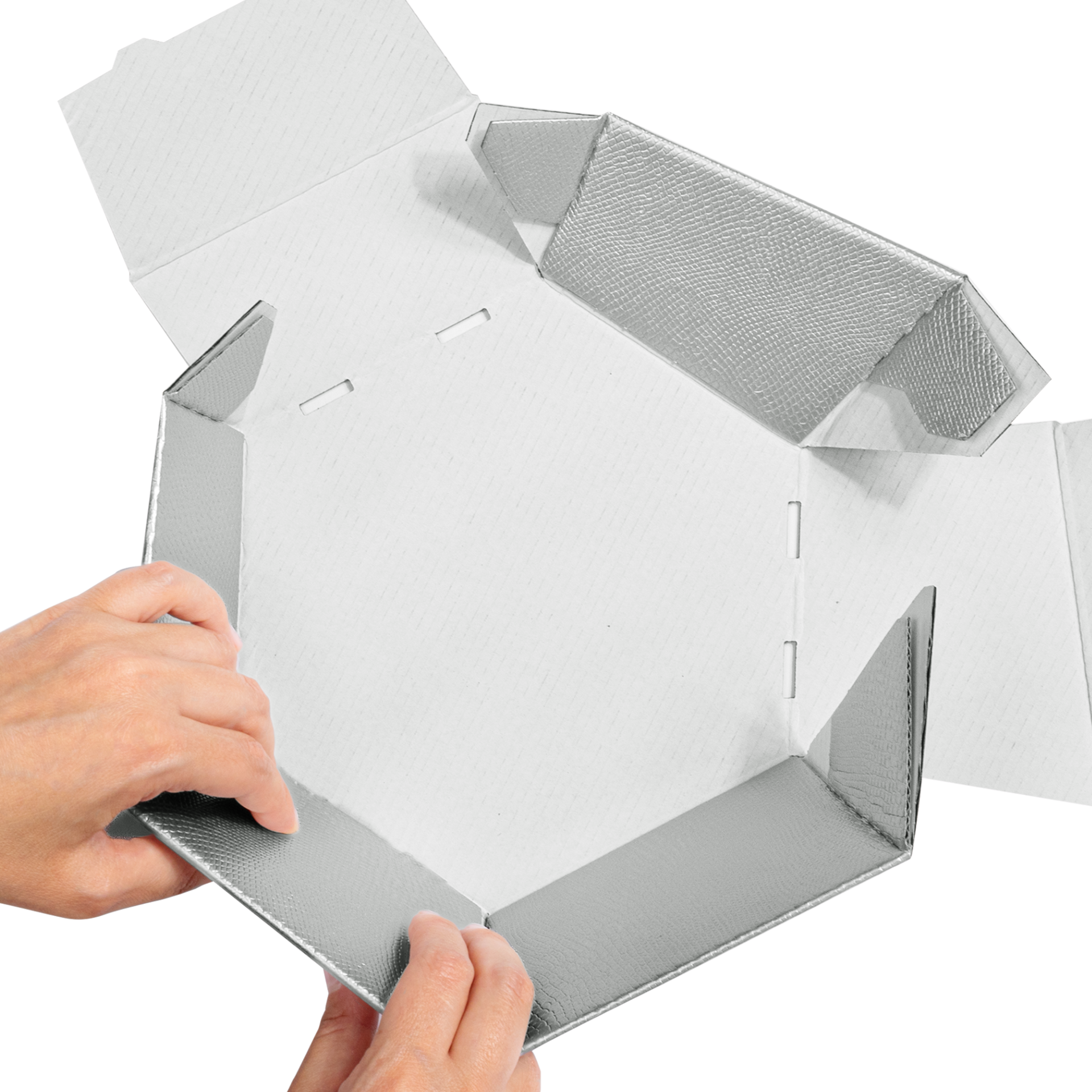 They ship flat for compact storage and fold in seconds thanks to the pre-creased fold lines. No scissors, tape or glue needed. On average, customers take about 1 minute to assemble a box.